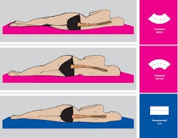 Лежать и спать следует на достаточно жестком матраце. Позвоночник должен находиться в прямом положении. Положите небольшую подушку под шею, а при болях в поясничной области – и под колени. Во время сна в положении лежа на боку, старайтесь держать бедра и колени в согнутом положении.