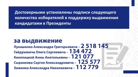 Рубеж в 100 тыс. подписей, необходимых для регистрации кандидатом в Президенты, преодолели 5 инициативных групп (О.С.Гайдукевича – 134 472 подписей, А.А.Канопацкой – 121 077, А.Г.Лукашенко – 2 518 145, С.А.Сыранкова – 125 577, А.Н.Хижняка – 112 779).