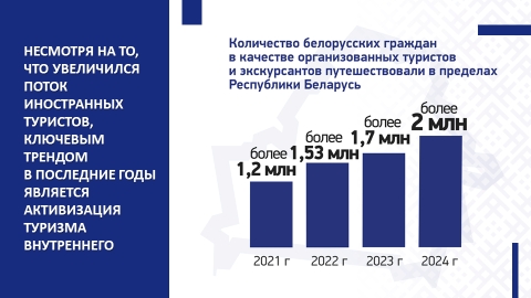 В течение 2021–2024 гг. туристический потенциал белорусского государства только укреплялся. COVID-19 и многое другое не стали препятствием для формирования устойчивой тенденции к развитию туристической отрасли в стране.