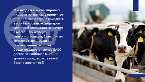 Доля экспорта продовольственных товаров и сельскохозяйственного сырья в общем экспорте республики за январь–ноябрь 2024 г. составила 21,0%. География экспорта продовольственных товаров и сельскохозяйственного сырья включает 116 стран (в январе–ноябре 2023 г. – 104 страны).