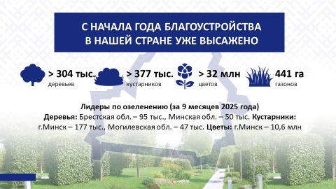 По цветочному оформлению в этом году в стране установлен своего рода рекорд. По данным Минприроды, за 9 месяцев высажено 32 млн цветов (в 2024 г. – 20,5 млн цветов). Больше всего высажено в столице – 10,6 млн цветов. Огромная работа проделана по высадке цветов, созданию клумб и цветочных композиций: в Могилевской области – 3,6 млн цветов; Брестской, Гомельской и Гродненской – по 3,5 млн.