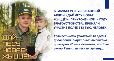 Участие в экологических акциях и проектах формирует чувство сопричастности, ответственности и гордости за страну. Например, только в этом году участие в республиканской акции «Дай лесу новае жыццё!» приняли около 113 тыс. человек. Совместными усилиями за время проведения акции было высажено порядка 45 млн саженцев деревьев, создано около 7 тыс. га лесных культур.