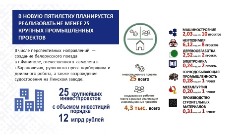 В новой пятилетке следует реализовать минимум 25 крупных инвестиционных проектов в промышленном секторе. В числе перспективных названы создание белорусского поезда в г.Фаниполе, отечественного самолета в г.Барановичах, рулонного пресс-подборщика и доильного робота, восстановление компетенций в судостроении на Пинском заводе.