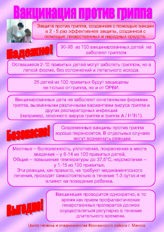 Подробности организации вакцинации детей против гриппа Вы можете уточнить тел. 324-18-52 (горячая линия), 304-33-55 (справочная), у своего участкового врача или у медицинского работника дошкольного учреждения/школы.